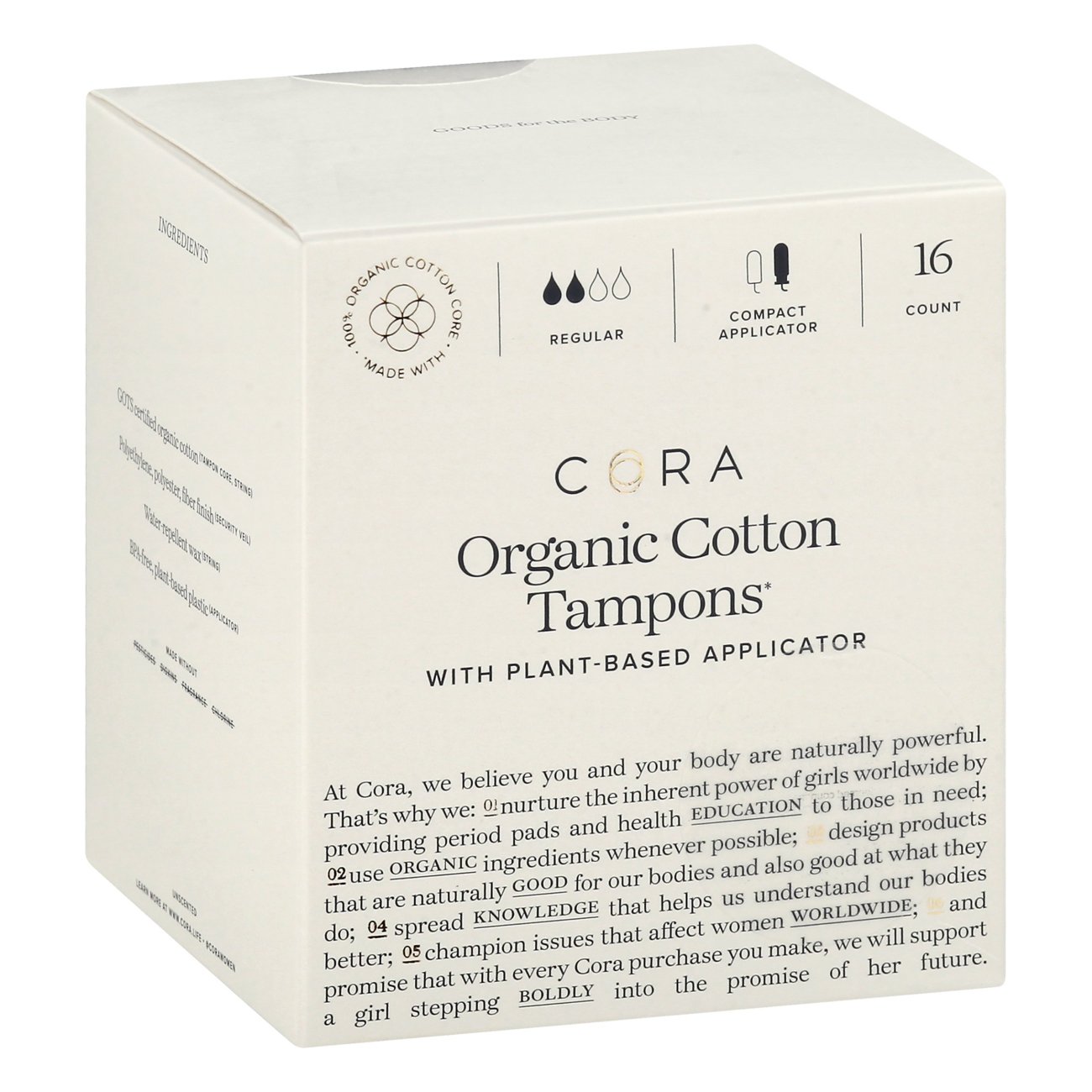 Organic Cotton Applicator Free Tampons Cora Cora Tampons Ingredients Hear from our cora community. 100 percent organic cotton (used for the. We also share some insights around sizing,. this guide explains how to insert an applicator tampon and an applicator free tampon from start to finish. the main ingredients list, which we access through the cora website, contains only two items: if you’re thinking of making. Cora Tampons Ingredients.